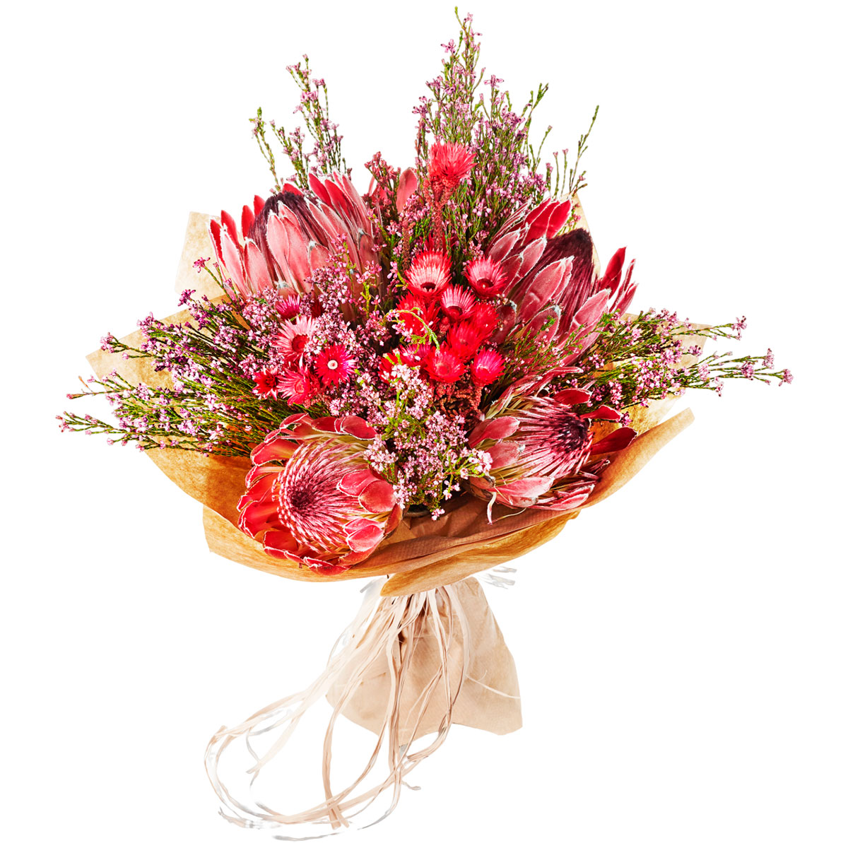 Протея, вереск розовый, мезембриантемум. Упаковка (лента, пленка, крафт, сетка, пленка матовая)