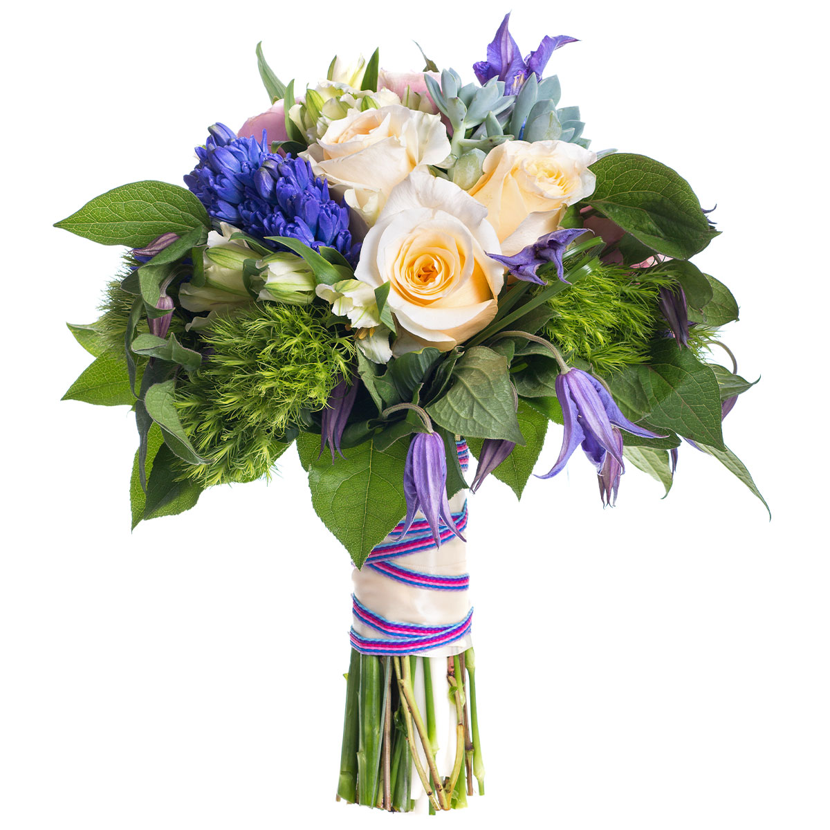 Роза одноголовая кремовая, гиацинт синий, клематис синий, суккулент, зелень. Упаковка (лента, пленка, крафт, сетка, пленка матовая)