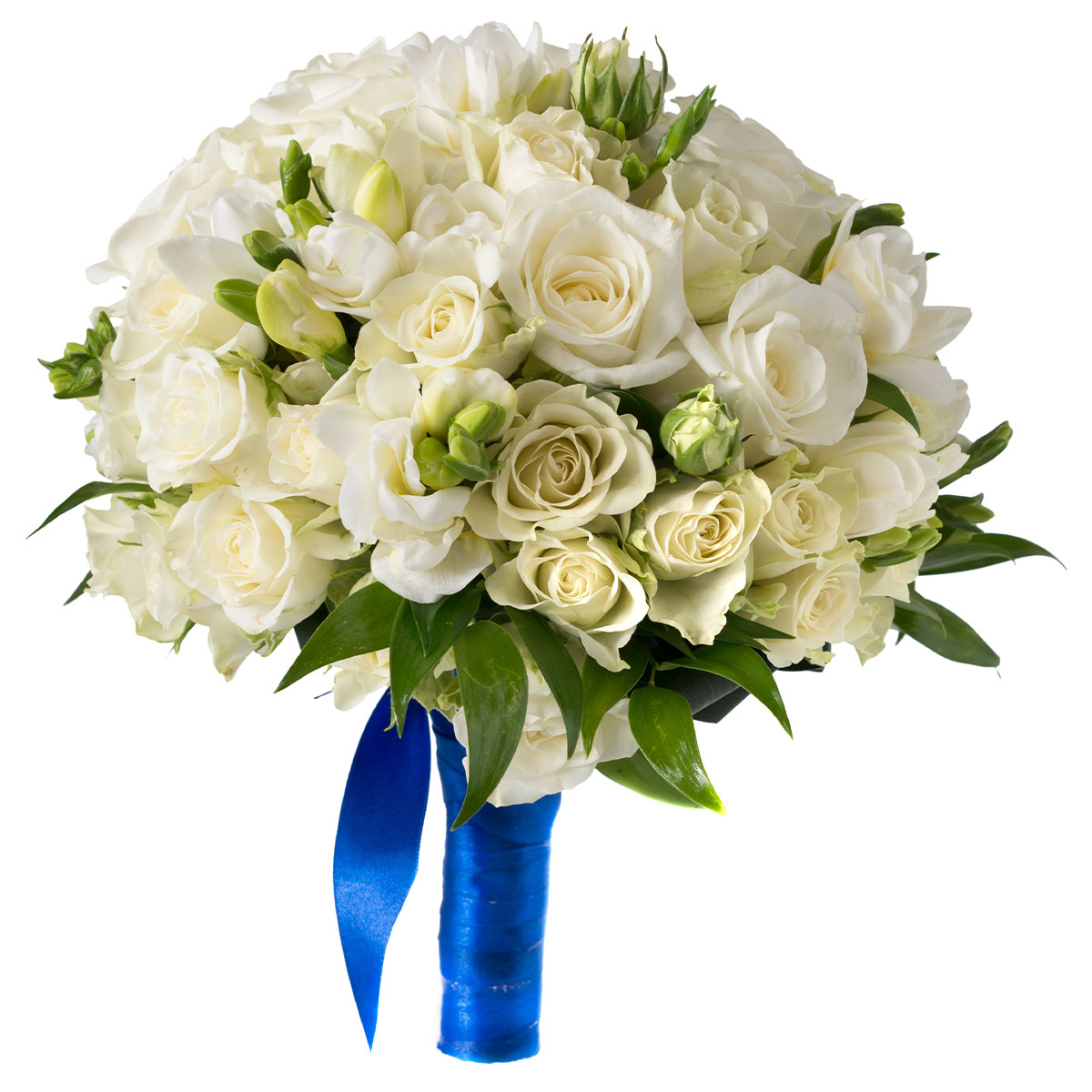 Роза одноголовая белая, роза кустовая белая, фрезия белая, зелень. Упаковка (лента, пленка, крафт, сетка, пленка матовая)