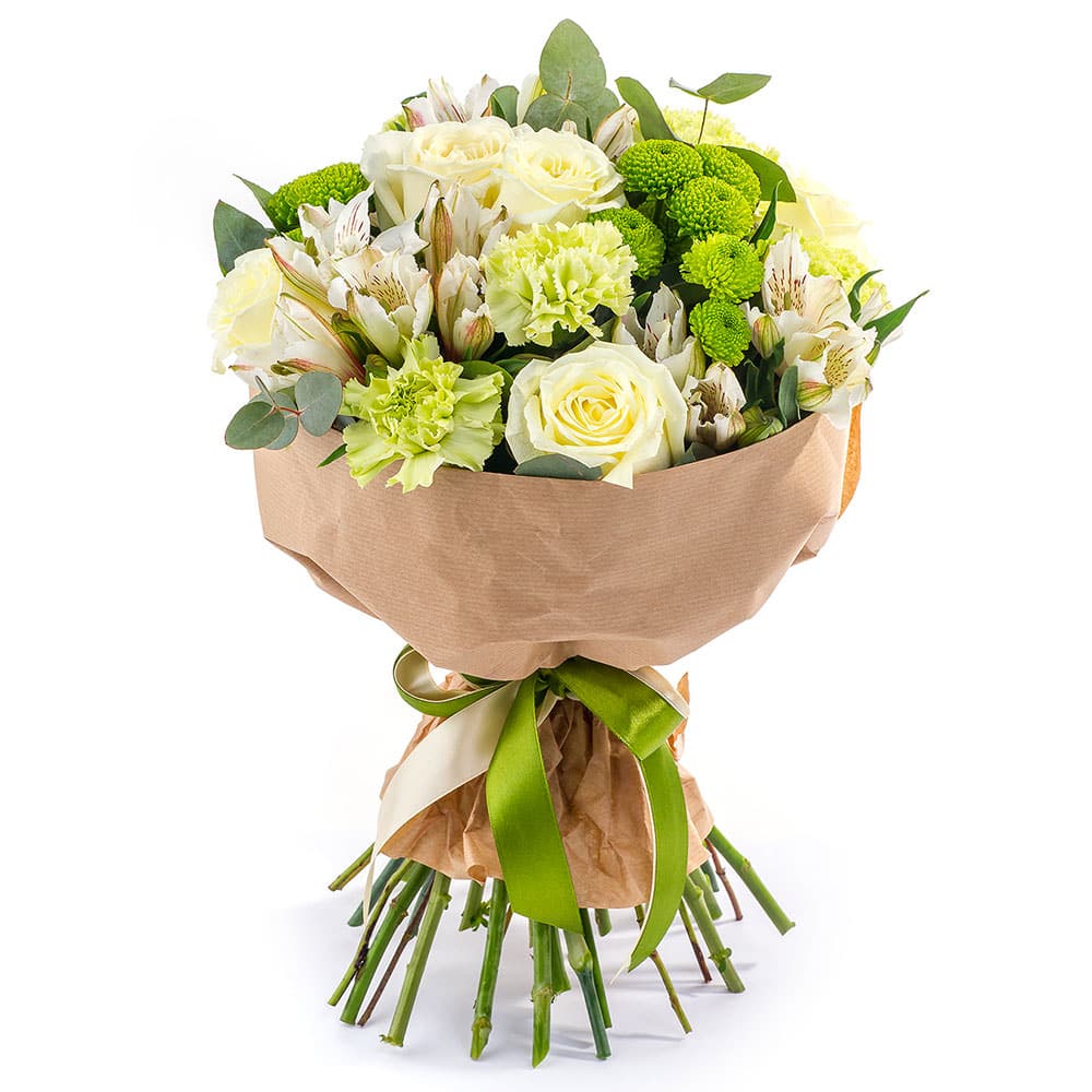 Роза одноголовая кремовая, альстромерия белая, хризантема кустовая зеленая, гвоздика зеленая, эвкалипт. Упаковка (лента, пленка, крафт, сетка, пленка матовая)