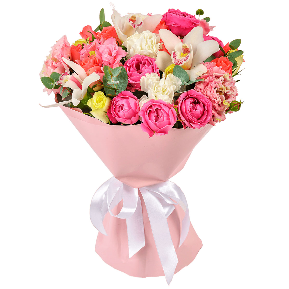 | Состав | Кустовые розы, Орхидеи, Пионовидные розы, Розы, Эвкалипт, Эустомы |