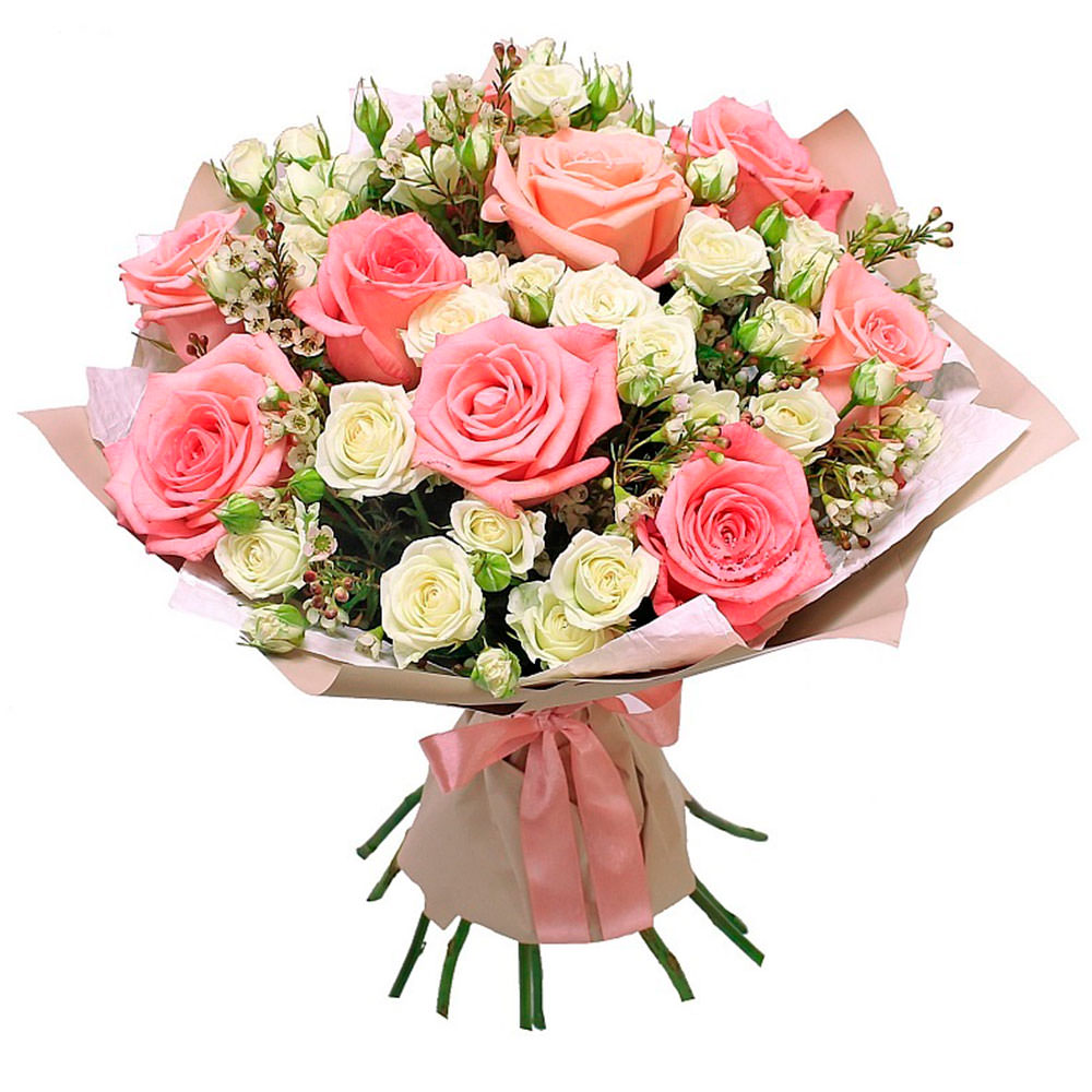 Роза одноголовая розовая, роза кустовая белая, ваксфлауэр. Упаковка (лента, пленка, крафт, сетка, пленка матовая)