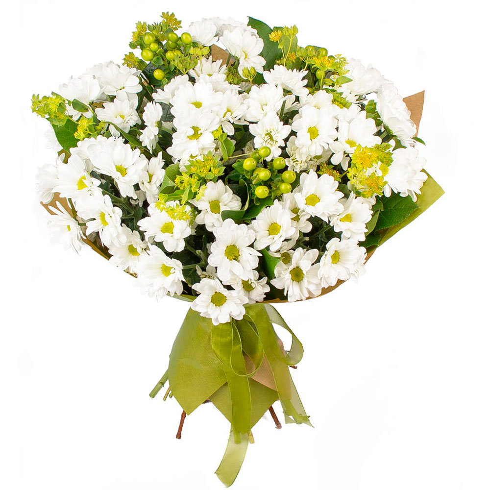 Хризантема белая кустовая, буплерум, гиперикум. Упаковка (лента, пленка, крафт, сетка, пленка матовая)